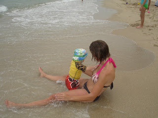 Parker had his first beach adventure and seemed to enojoy it. He really liked to play in the sand, but wasn't so sure about the waves. The ocean was pretty choppy and even when I was standing knee deep the waves would splash up to our faces. I would have to lift Parker above my head which scared him. We flew home on Sunday morning, Parker did pretty well, but he did show off his voice with his little schreech. I thought it was pretty cute but I don't know about everyone esle on the plane.